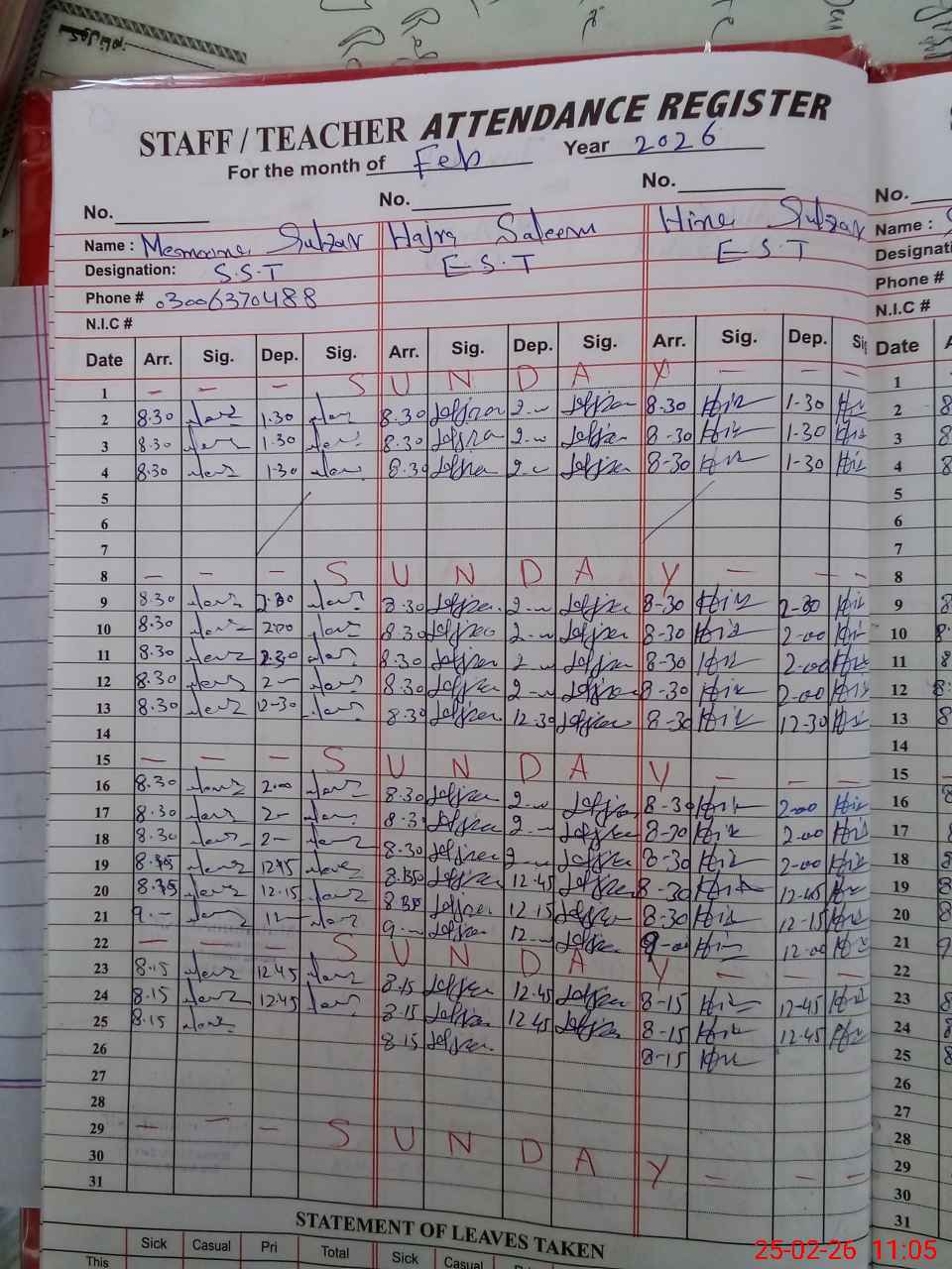 | CNIC | Full Name | Designation | R/C | Absence During Last Calender Month |