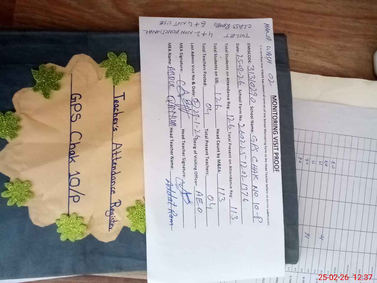 | Attendance Register | Head Teacher | MEA with School | Visit Proof |
