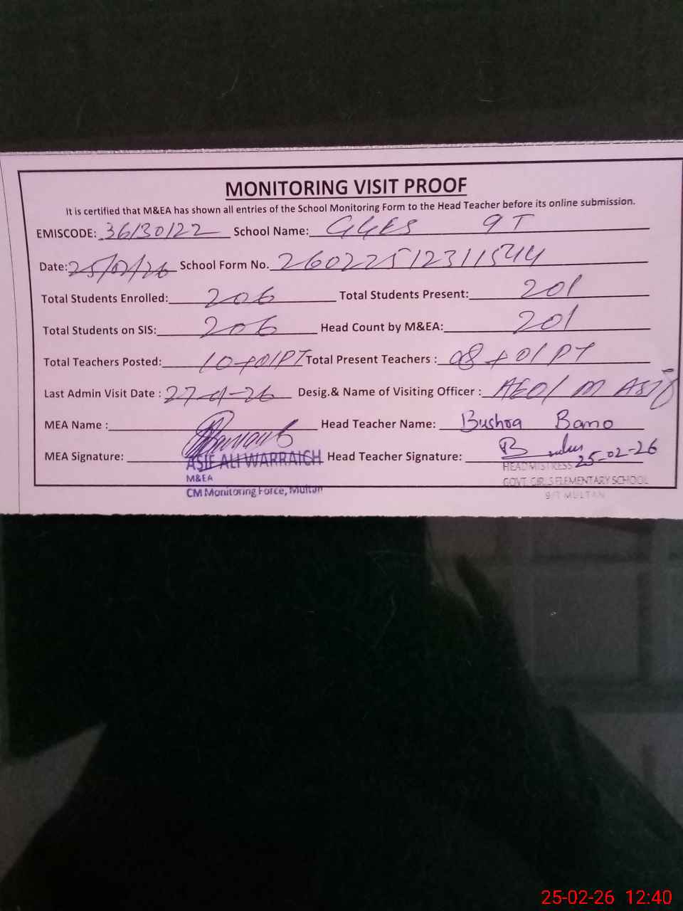 | Certified that this School was Inspected by the Undersigned MEA/DMO Today and the Information Stated Above is as Per Record. | |||||