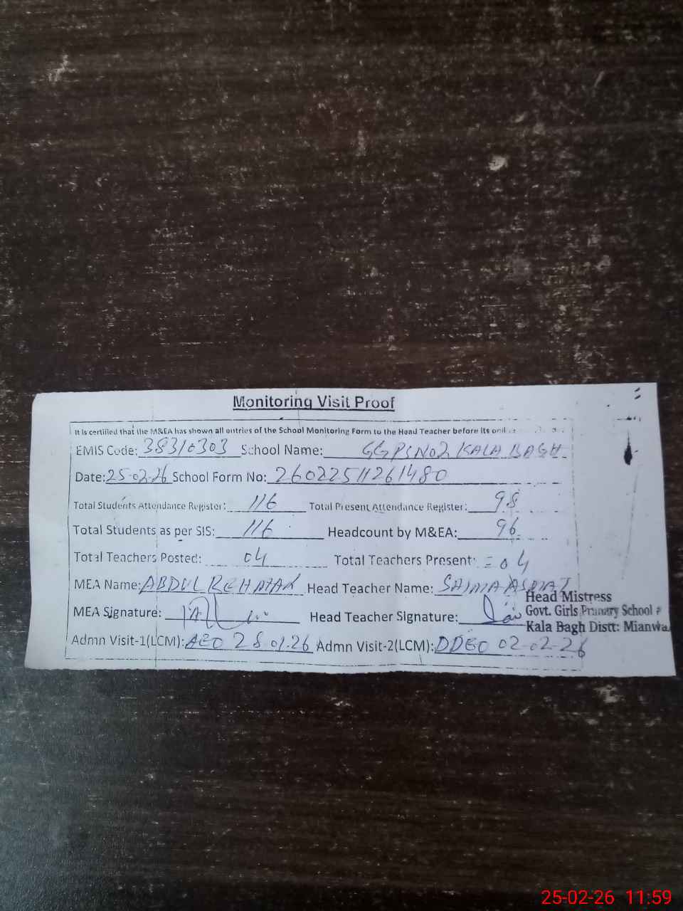 | EMIS Code: 38310303 | Name of School: GGPS NO. 2 KALA BAGH | |||