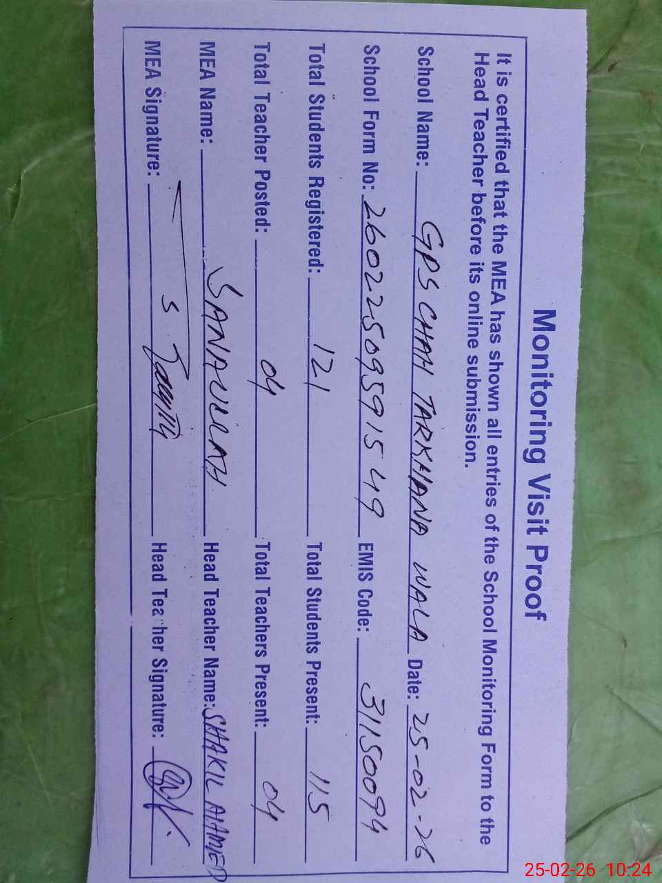| Attendance Register | Head Teacher | MEA with School | Visit Proof |