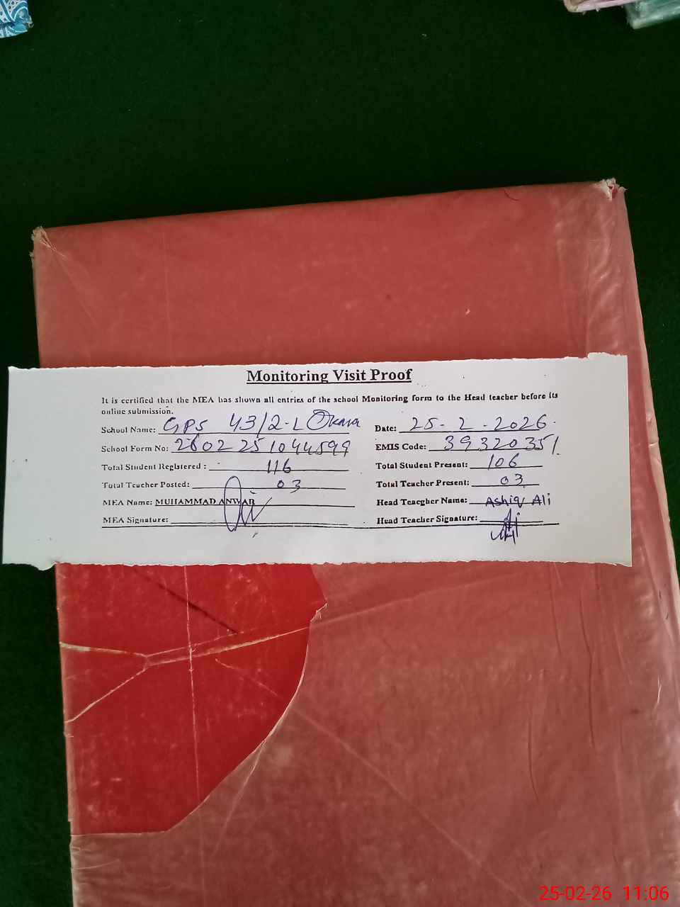 | Attendance Register | Head Teacher | MEA with School | Visit Proof |