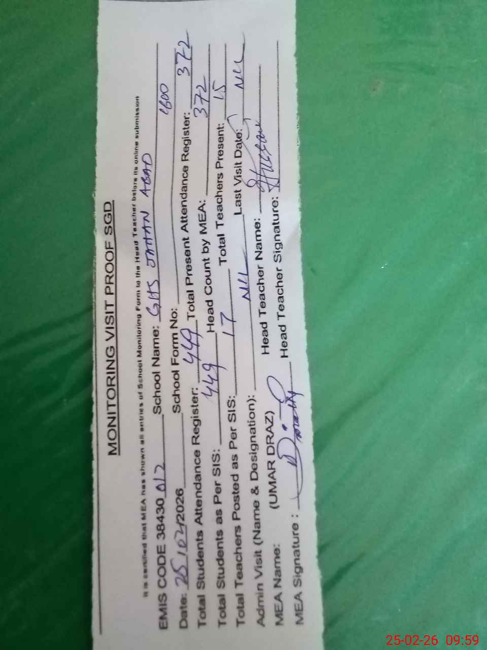 | Attendance Register | Head Teacher | MEA with School | Visit Proof |