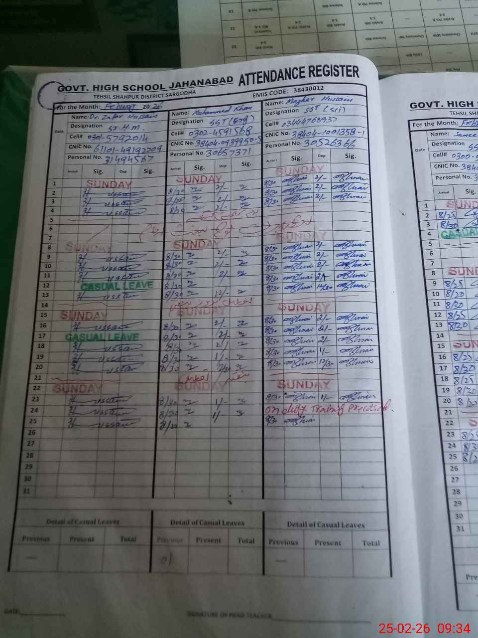 | CNIC | Full Name | Designation | R/C | Absence during last cal. month |