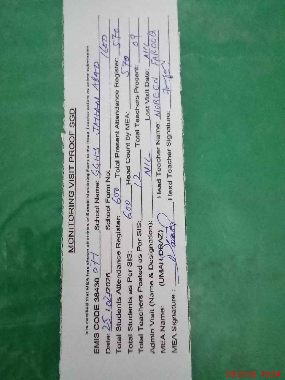 | Attendance Register | Head Teacher | MEA with School | Visit Proof |