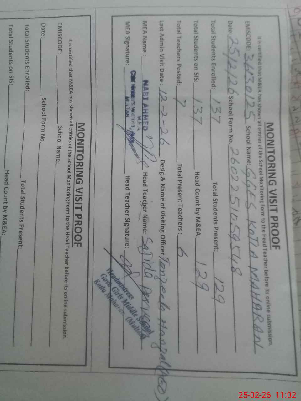 | Certified that this School was Inspected by the Undersigned MEA/DMO Today and the Information Stated Above is as Per Record. | |||||