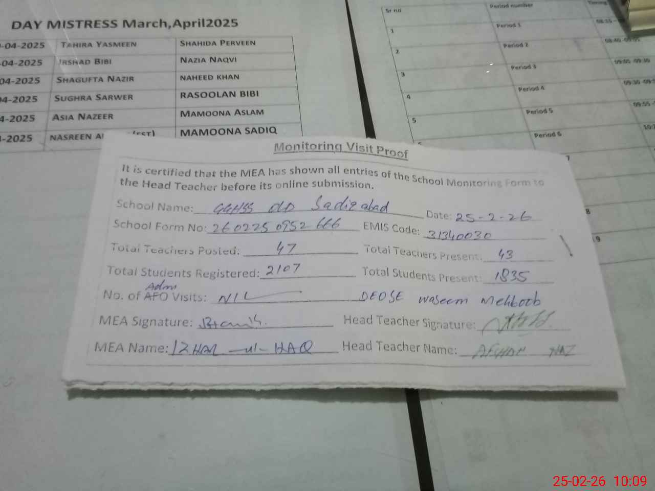 | Monitoring Date: 25-02-2026 | Start Time: 25-02-2026 09:20 AM | End Time: 25-02-2026 10:14 AM | Name of MEA: Mu**** Iz**** UlHa**** | |