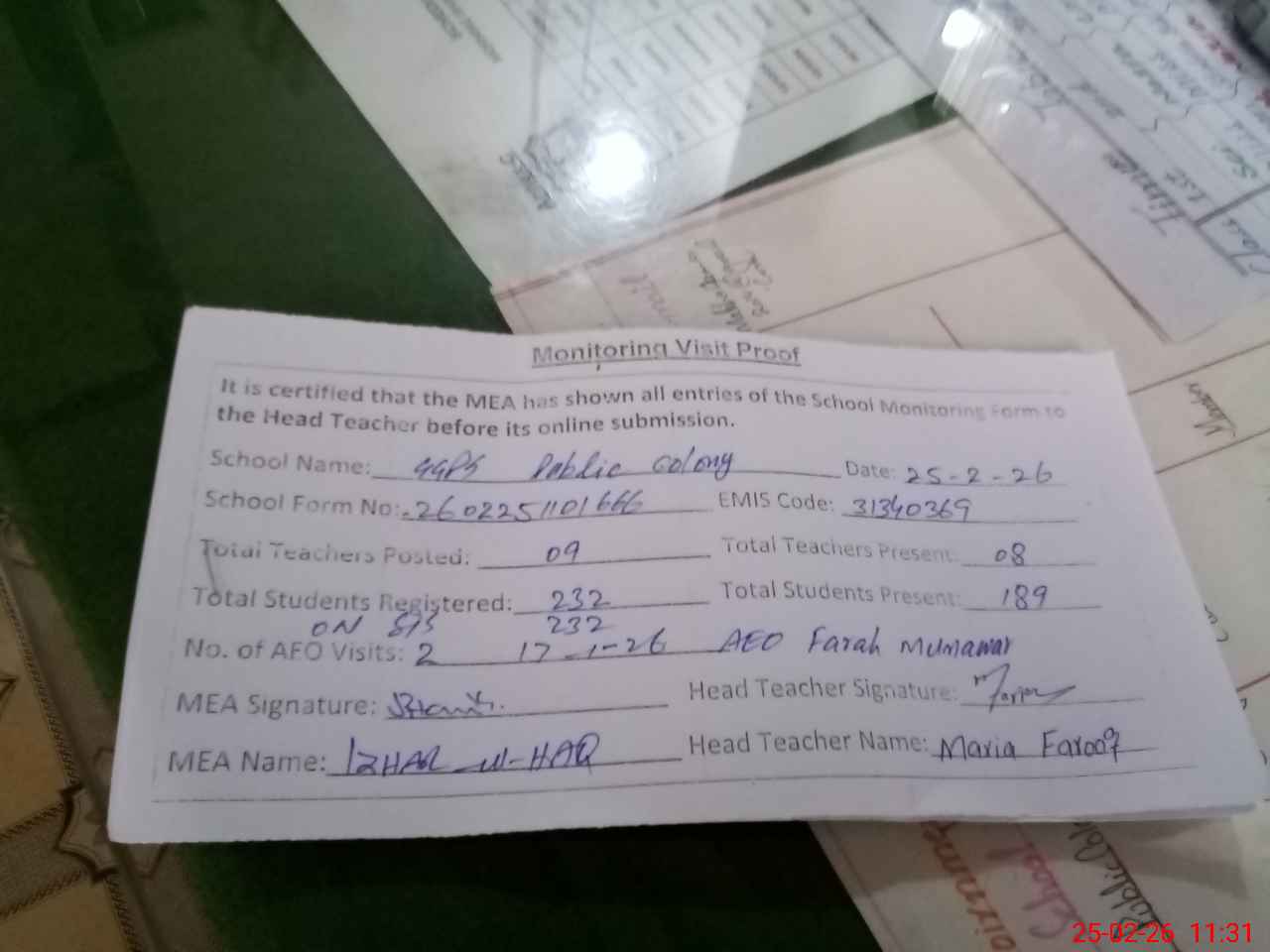 | Monitoring Date: 25-02-2026 | Start Time: 25-02-2026 11:01 AM | End Time: 25-02-2026 11:32 AM | Name of MEA: Mu**** Iz**** UlHa**** | |