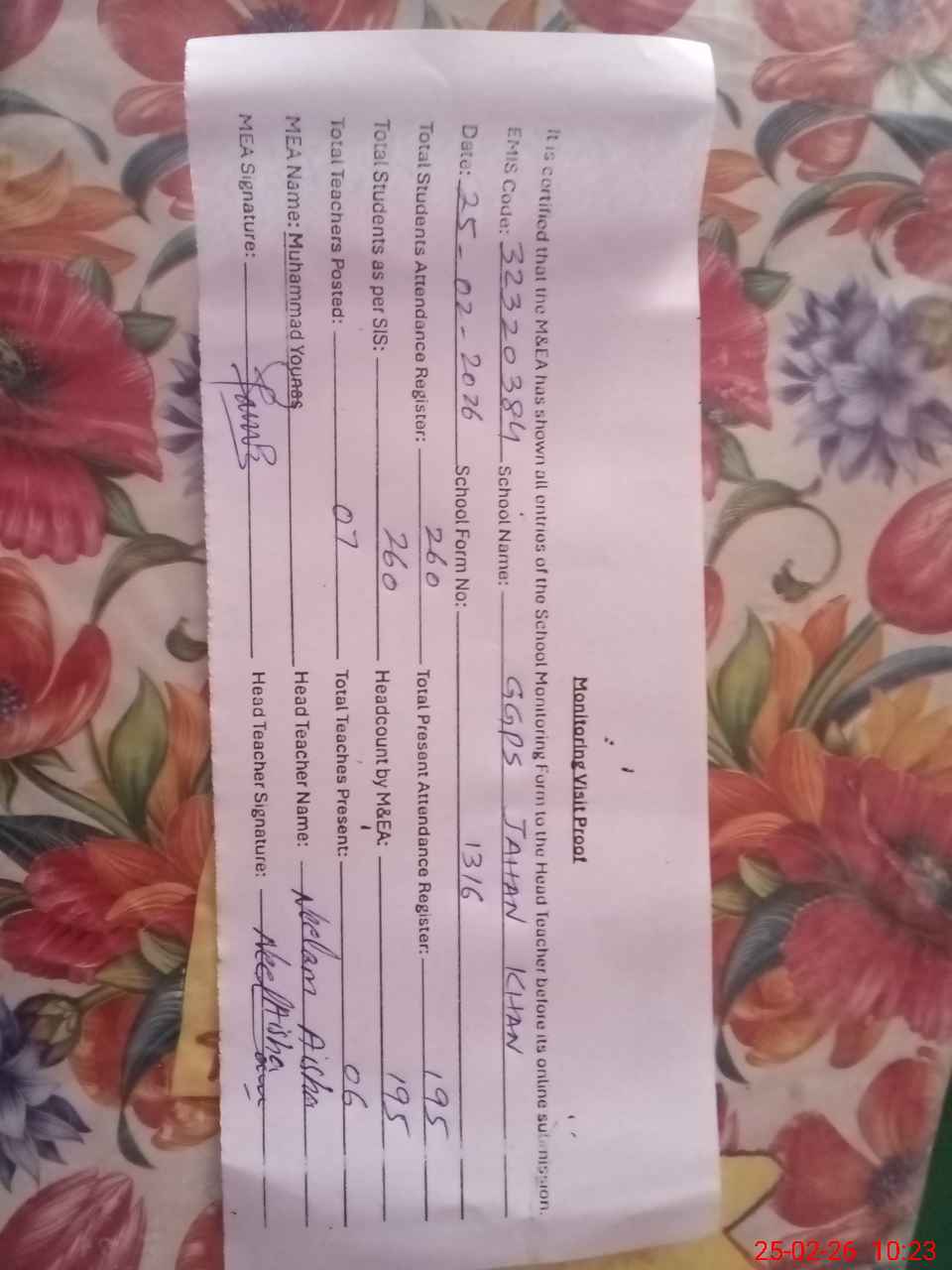 | Attendance Register | Head Teacher | MEA with School | Visit Proof |