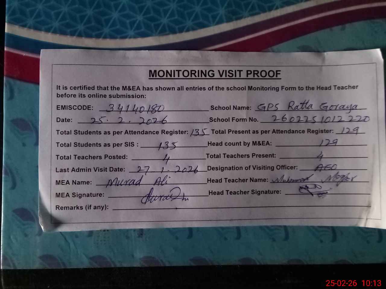 | EMIS Code: 34140180 | Name of School: GPS RATTA GORAYA | |||