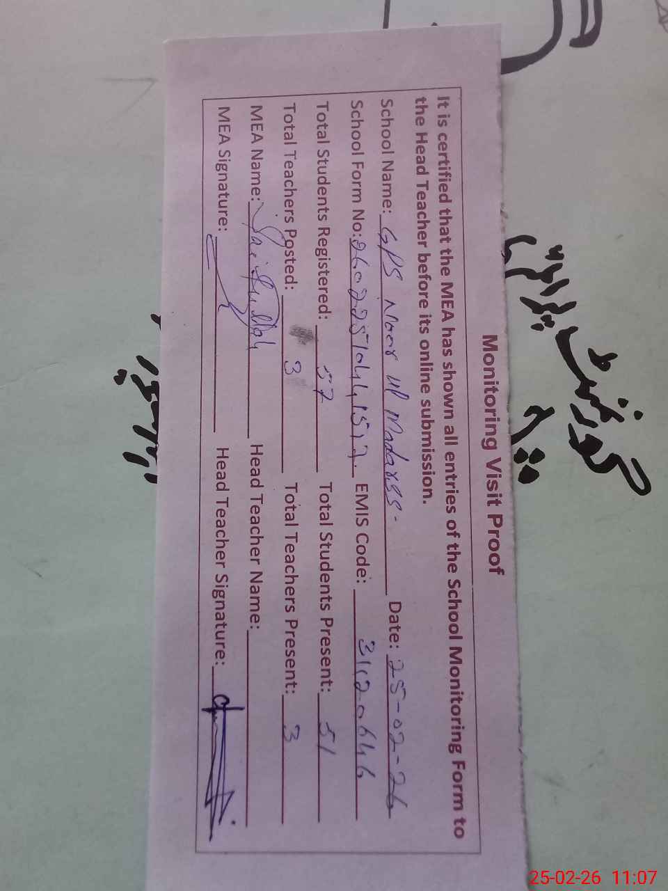 | EMIS Code: 31120646 | Name of School: GPS NOOR UL MADARSS | |||