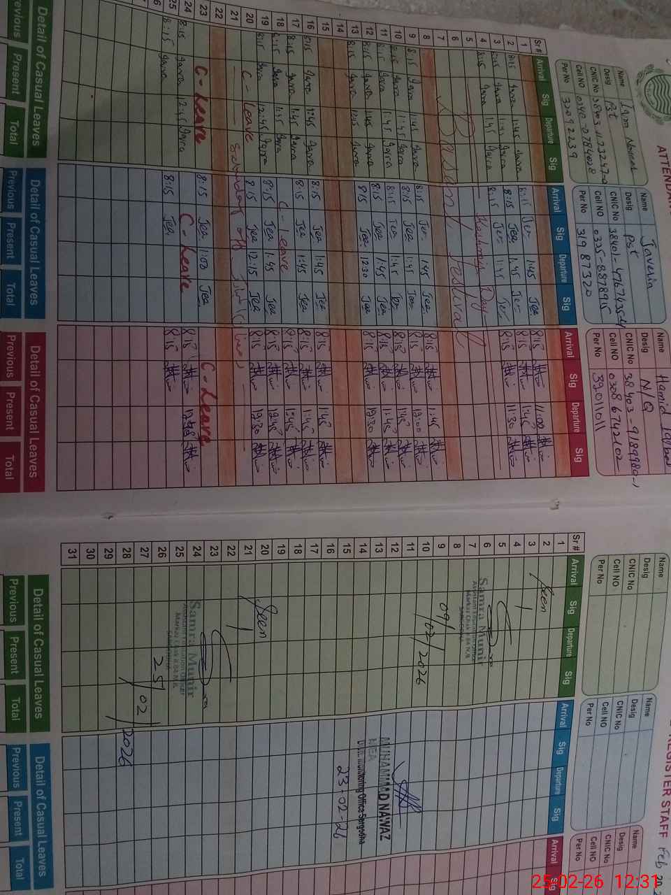 | CNIC | Full Name | Designation | R/C | Absence during last cal. month |