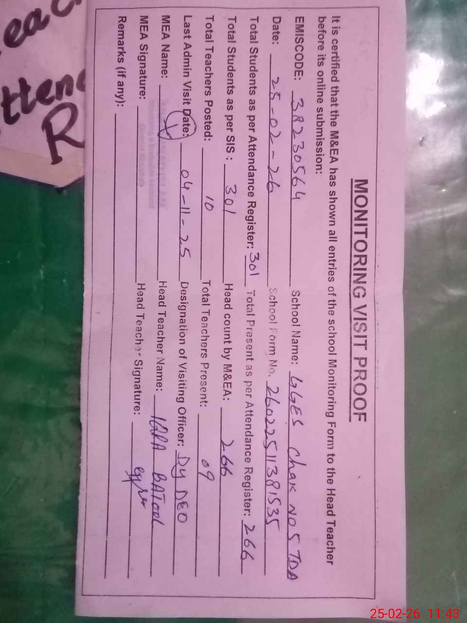 | Remarks (Use Separate Page if Required): Dy DEO visited school on 4 November 2025 students strength on sis 301 | |||||