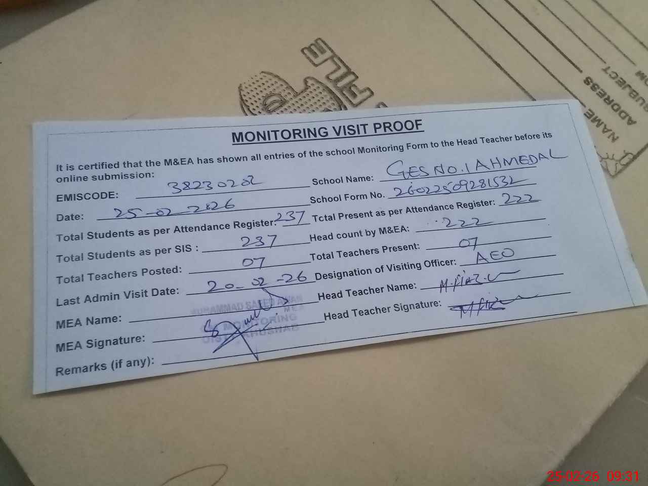 | Remarks (Use Separate Page if Required): Data refilled. Students on SIS QTY 237 Last admin visit On 20 February 2026 by AEO | |||||