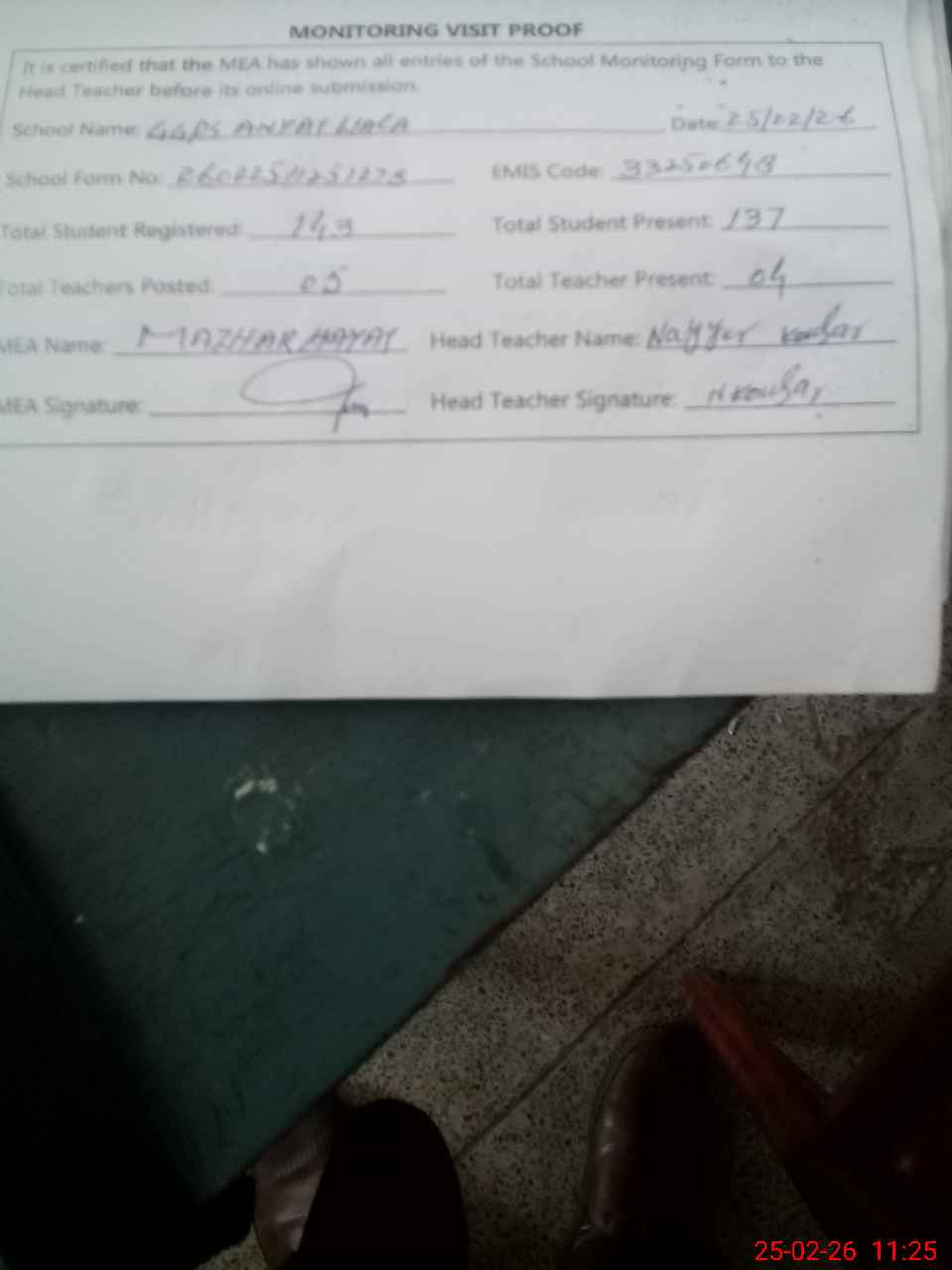 | Attendance Register | Head Teacher | MEA with School | Visit Proof |