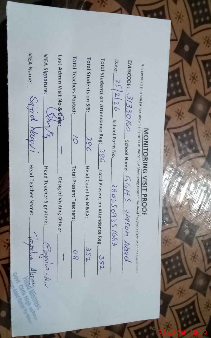 | EMIS Code: 31330160 | Name of School: GGHS HASAN ABAD | |||