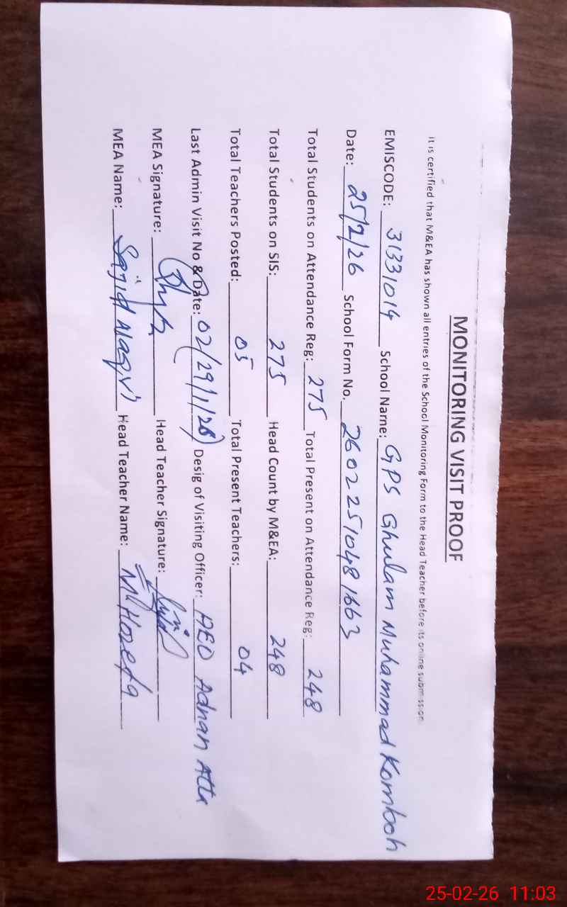 | EMIS Code: 31331014 | Name of School: GPS GHULAM MUHAMMAD KOMBOO | |||