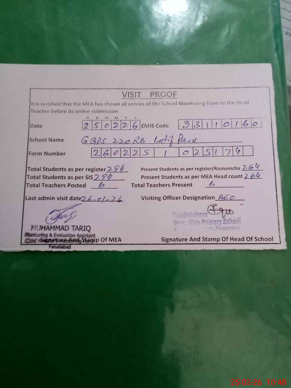 | EMIS Code: 33110160 | Name of School: GGPS CHAK NO 220 RB LATIF PARK | |||