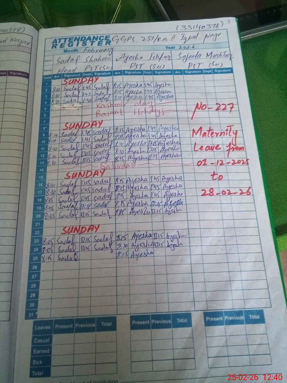 | Leave | Duty | Absent | Maternity | Medical | Ex- Pak |