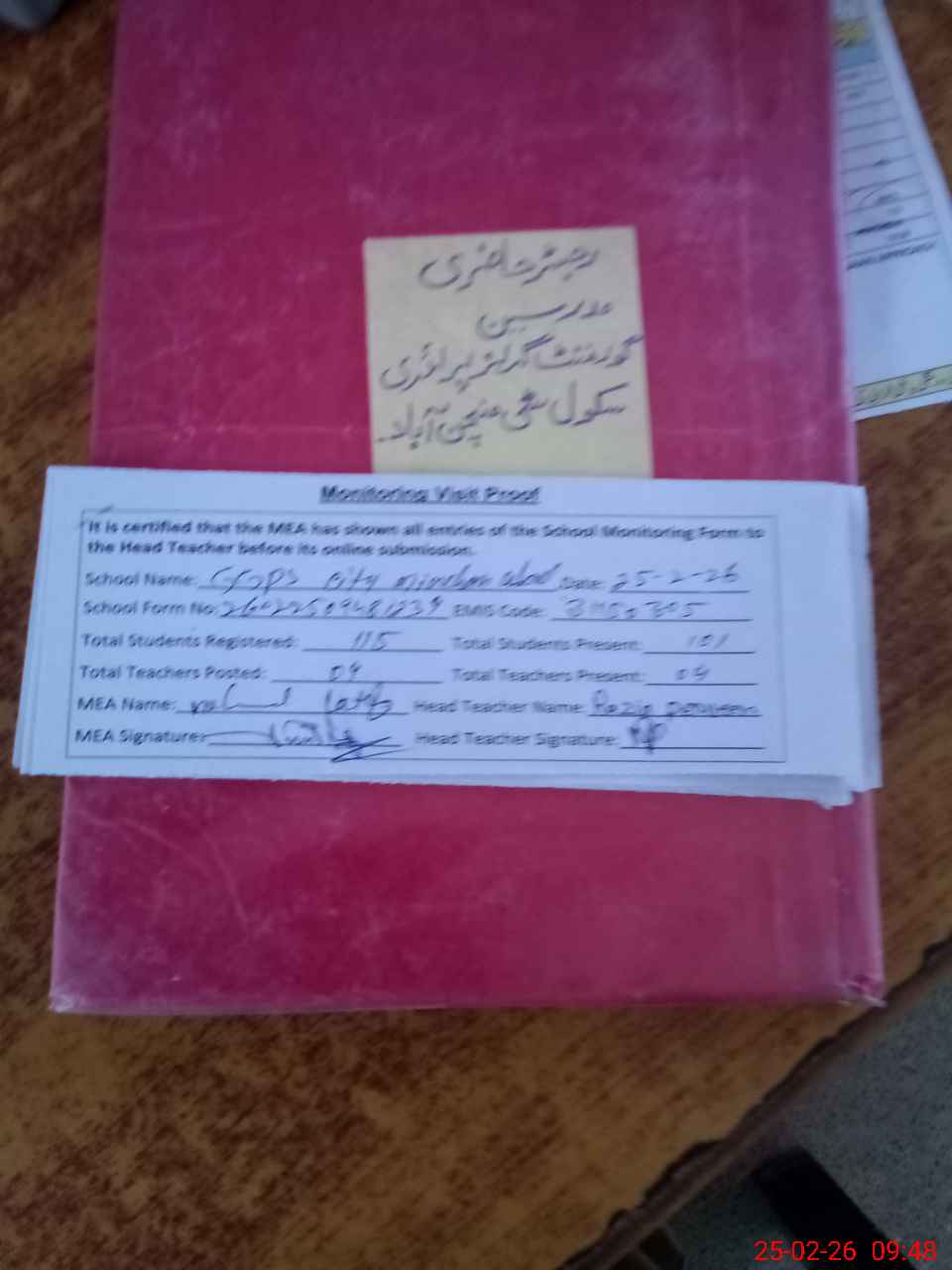 | Attendance Register | Head Teacher | MEA with School | Visit Proof |