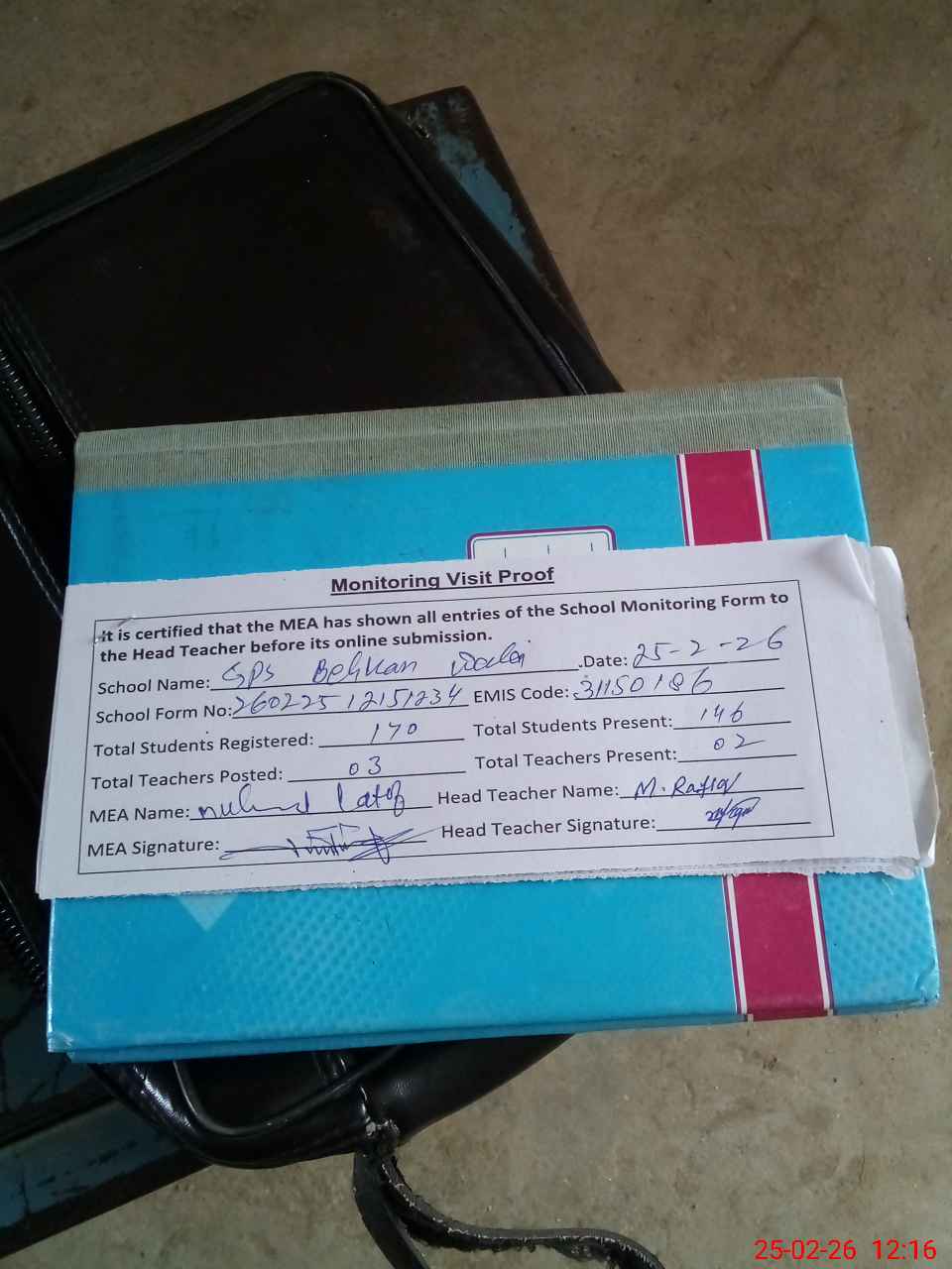 | Attendance Register | Head Teacher | MEA with School | Visit Proof |