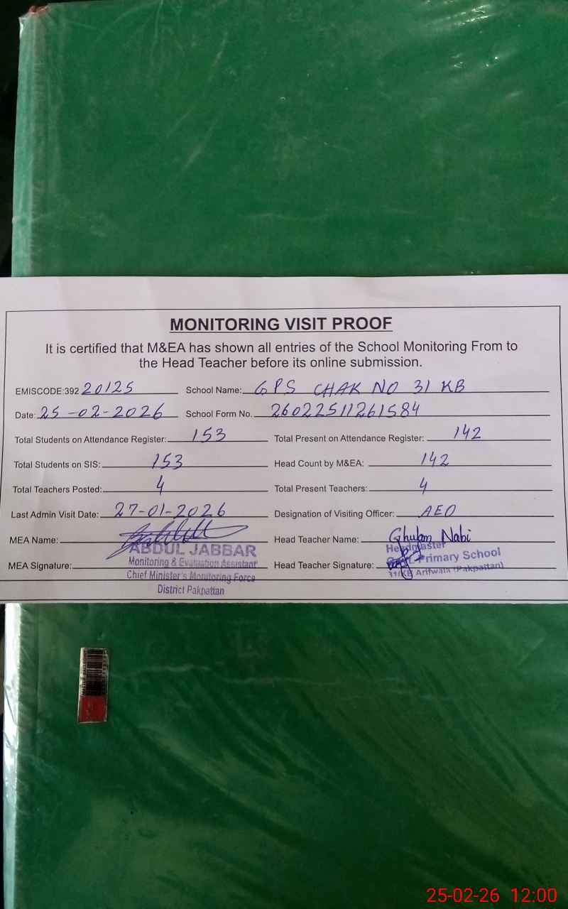 | EMIS Code: 39220125 | Name of School: GPS CHAK NO. 31 KB | |||