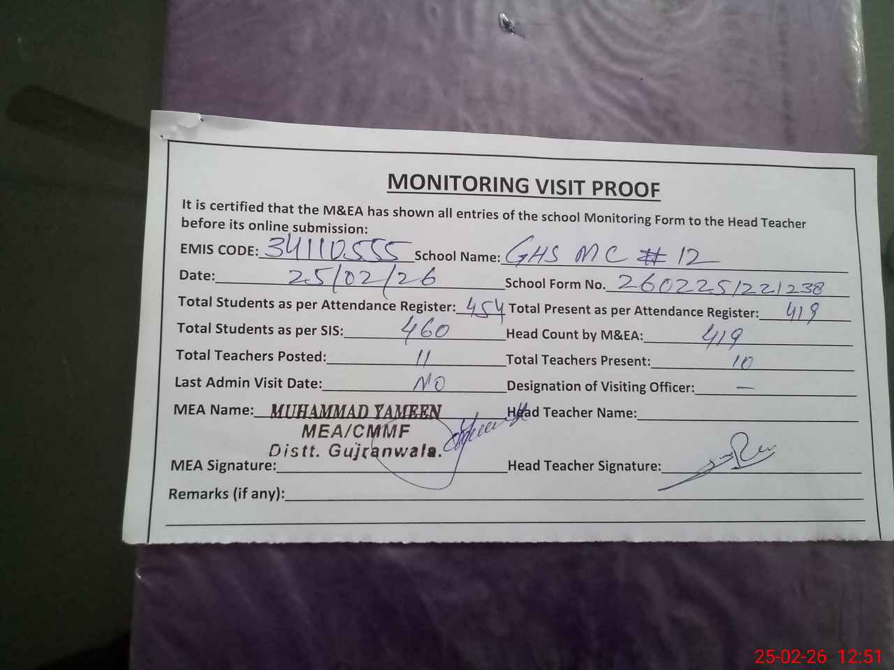 | Attendance Register | Head Teacher | MEA with School | Visit Proof |