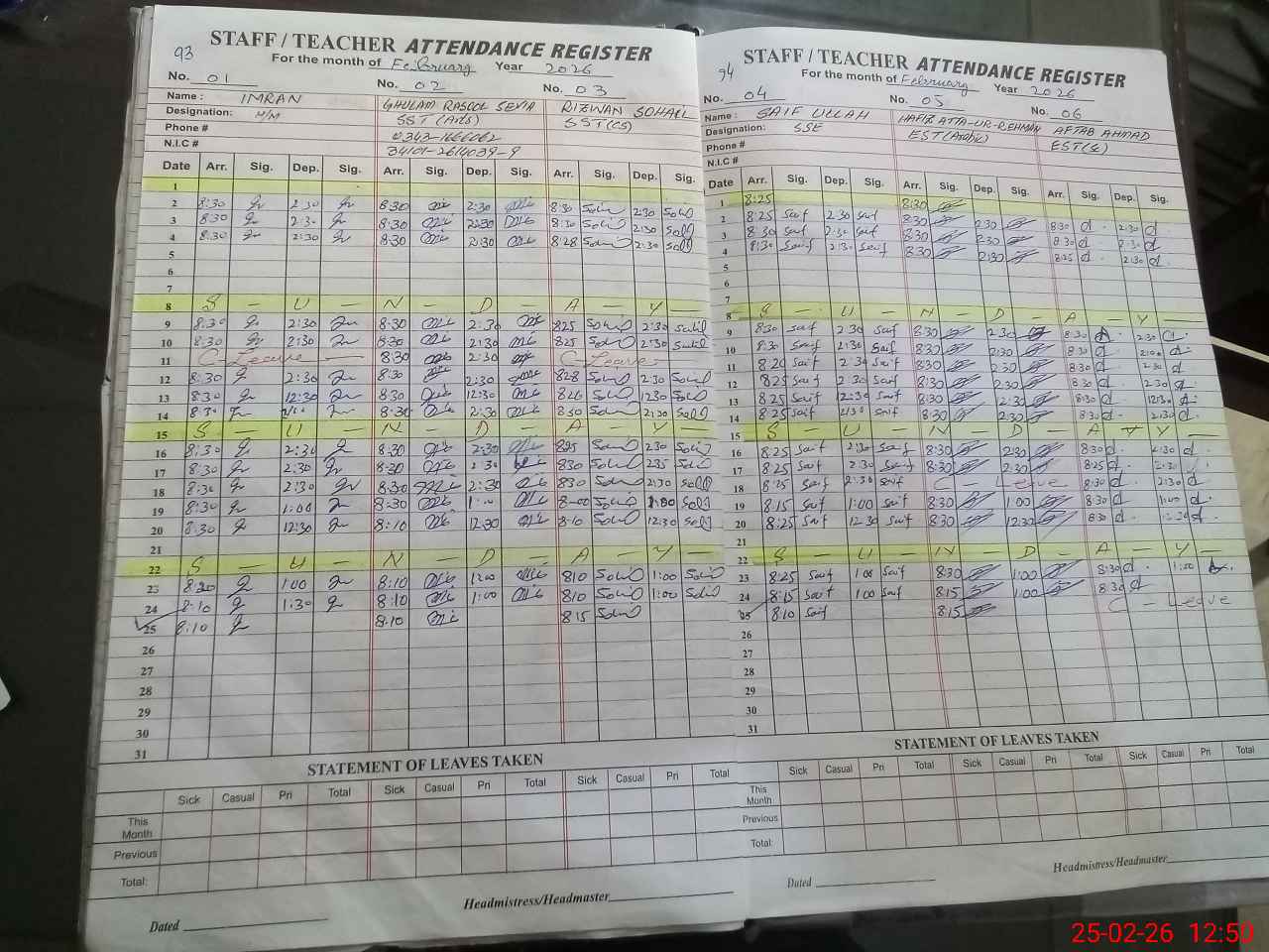 | CNIC | Full Name | Designation | R/C | Absence During Last Calender Month |