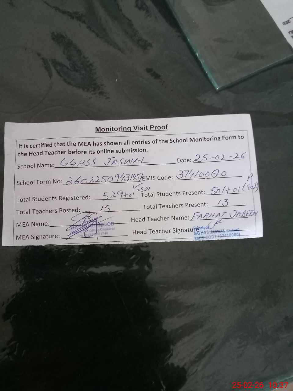 | Attendance Register | Head Teacher | MEA with School | Visit Proof |