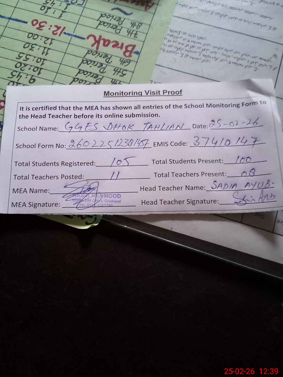 | Attendance Register | Head Teacher | MEA with School | Visit Proof |