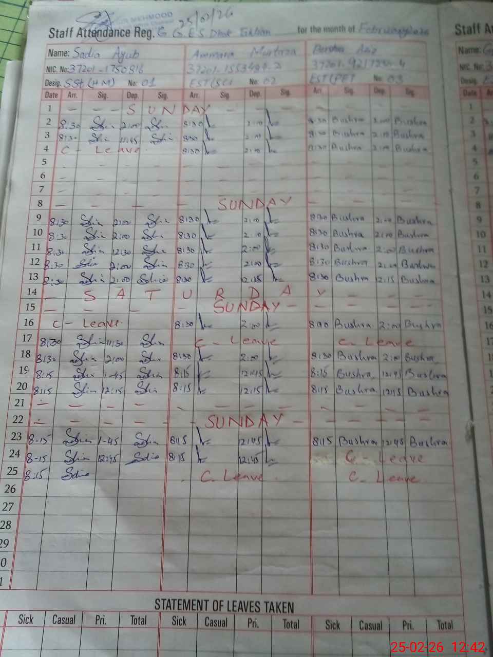 | CNIC | Full Name | Designation | R/C | Absence During Last Calender Month |
