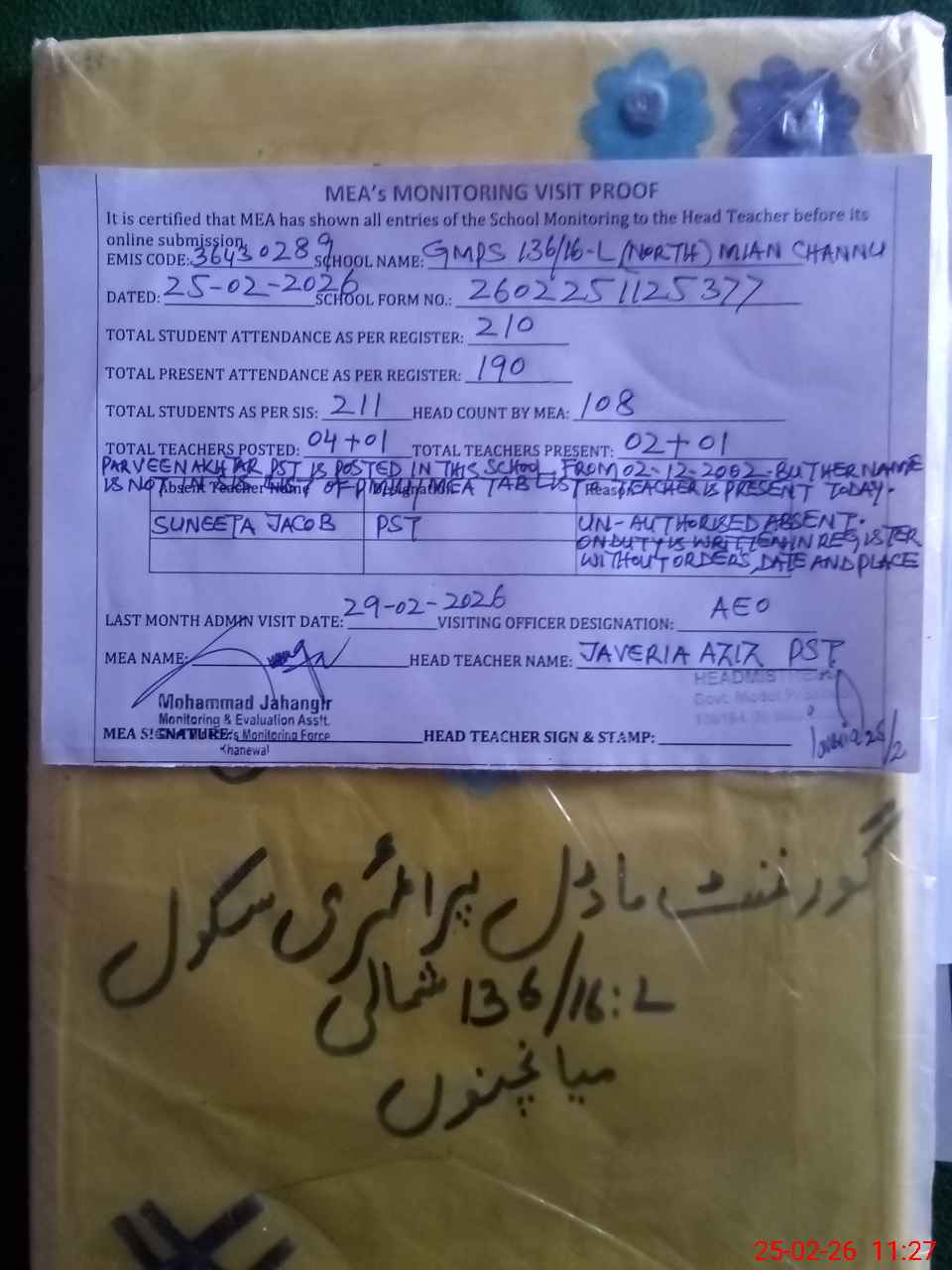 | EMIS Code: 36430289 | Name of School: GMPS 136/16-L NORTH, P/O 135/16-L STUNTZABAD, MIAN CHANNU | |||
