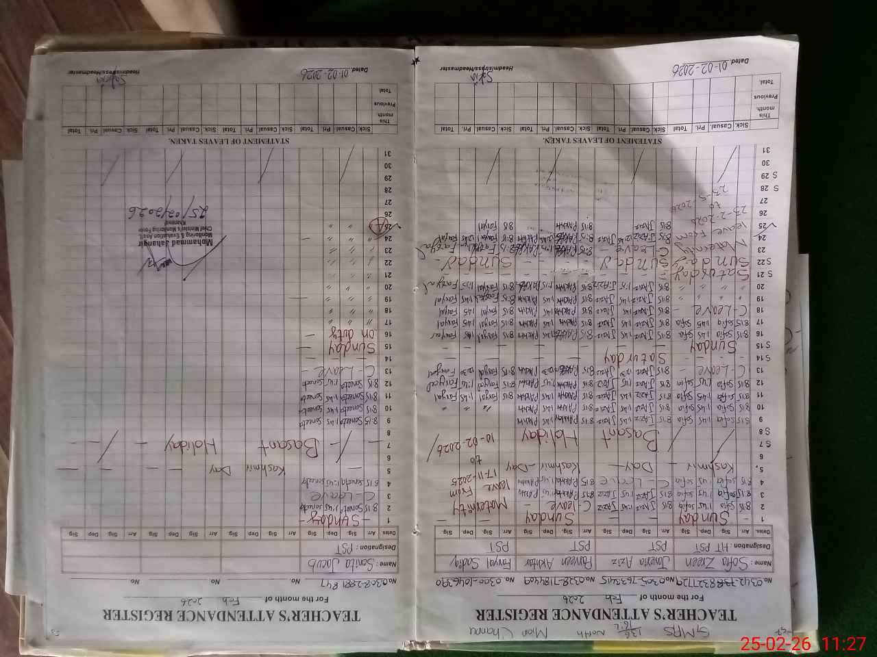 | Remarks (Use Separate Page if Required): SUNEETA JACOB PST FOUND UN AUTHORISED ABSENT FROM DUTY IN STAFF ATTENDANCE REGISTER OFFICIAL DUTY IS WRITTEN WITHOUT ORDERS DATE AND PLACE FROM 16 FEBRUARY 2026 TO TILL NO DATE IS MENTIONED PARVEEN AKHTAR PST IS POSTED IN THIS SCHOOL FROM 02 DECEMBER 2002 BUT HER NAME IS NOT IN SIS LIST OF PMIU MEA TAB LIST TEACHER IS PHYSICALLY PRESENT TODAY FTF RECORDS ARE NOT MAINTAINED | |||||