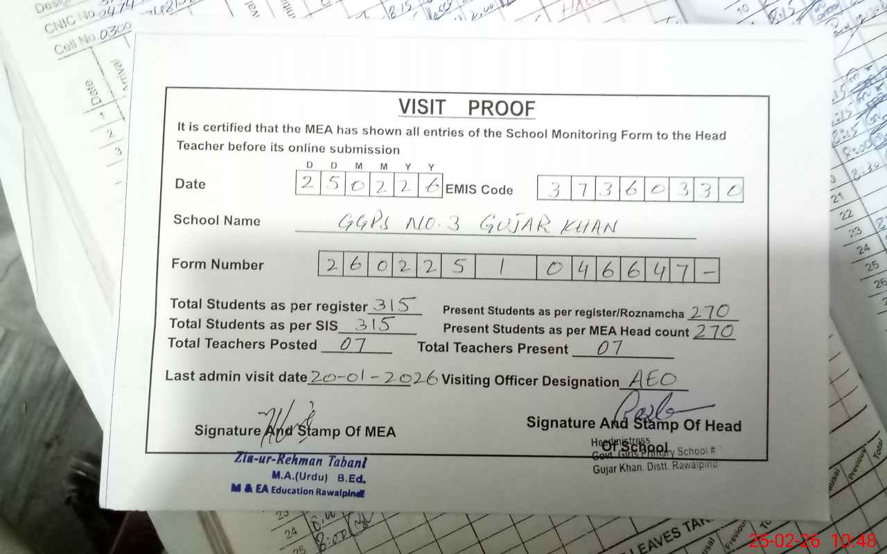 | EMIS Code: 37360330 | Name of School: GGPS NO. 3 GUJAR KHAN | |||