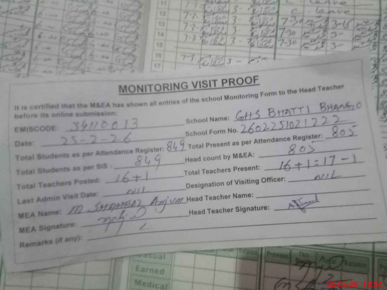 | Attendance Register | Head Teacher | MEA with School | Visit Proof |