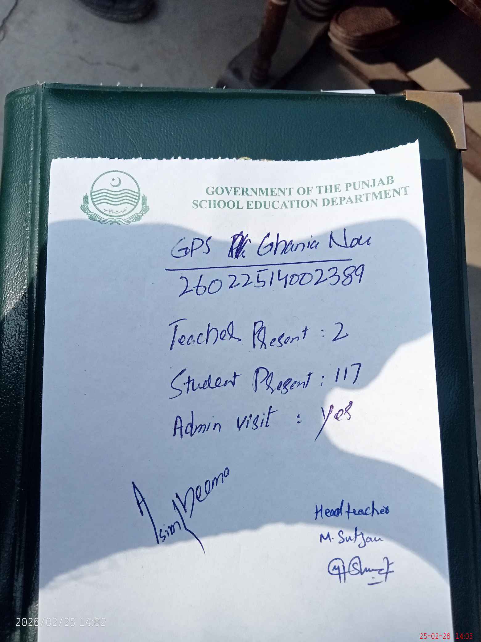 | Name: SU**** Designation: (School Headmaster's/Headmistress's) PST/PTC/JV Phone/Cell Number: 03**** |
