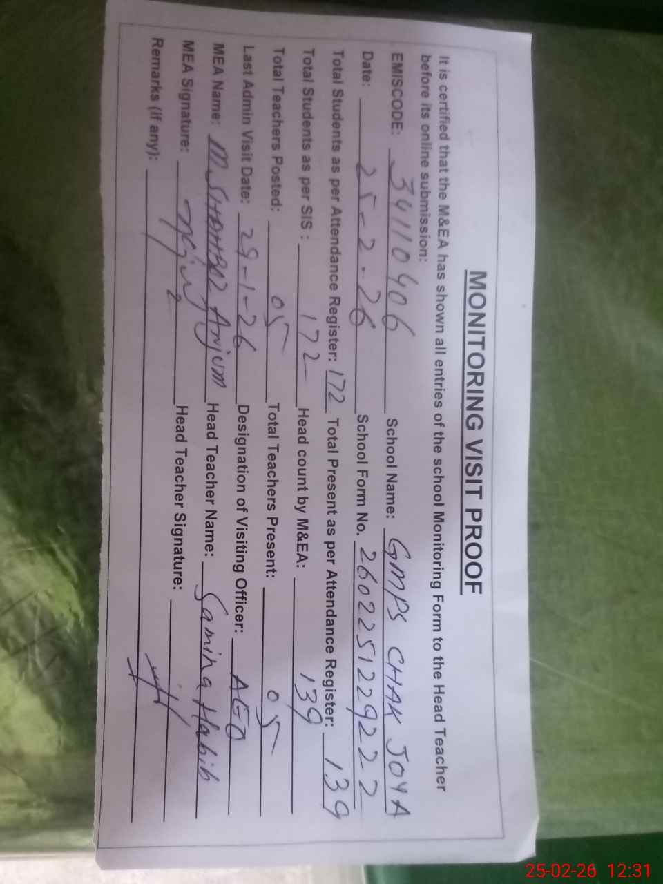 | Attendance Register | Head Teacher | MEA with School | Visit Proof |