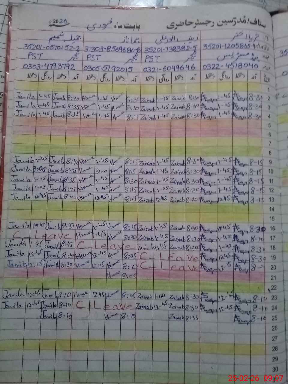 | Remarks (Use Separate Page if Required): Teacher Sabiha Maryam PST is not punctual she often coming late in School also remained absent 02 to 07 days in each month from September 2025 to February 26 | |||||