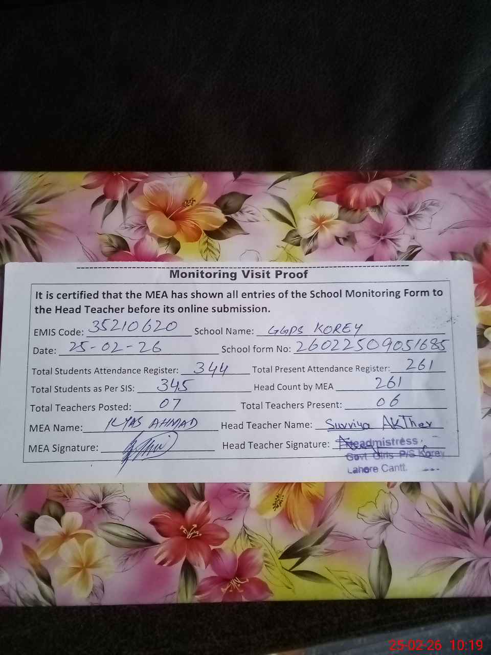 | Certified that this School was Inspected by the Undersigned MEA/DMO Today and the Information Stated Above is as Per Record. | |||||
