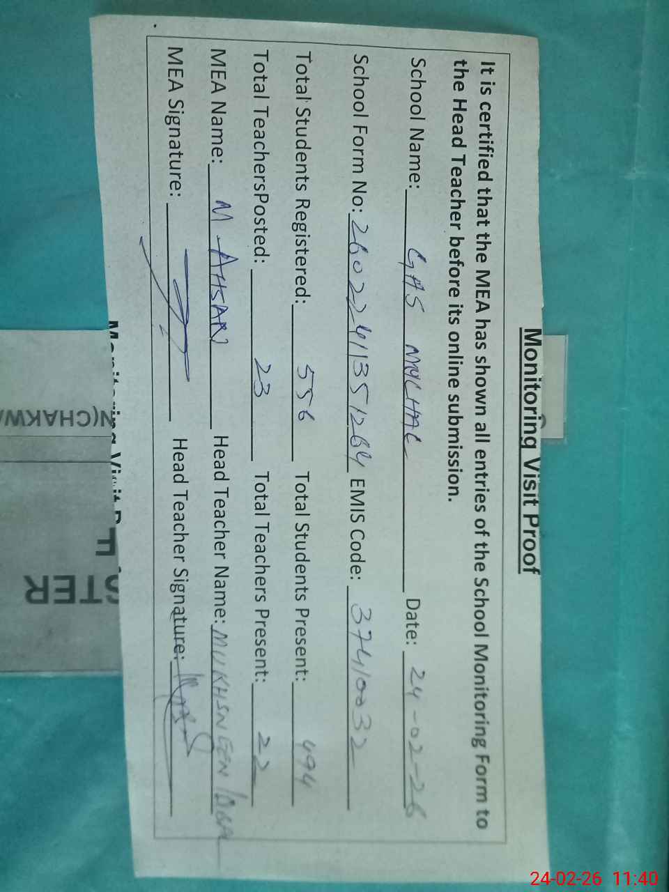 | Attendance Register | Head Teacher | MEA with School | Visit Proof |