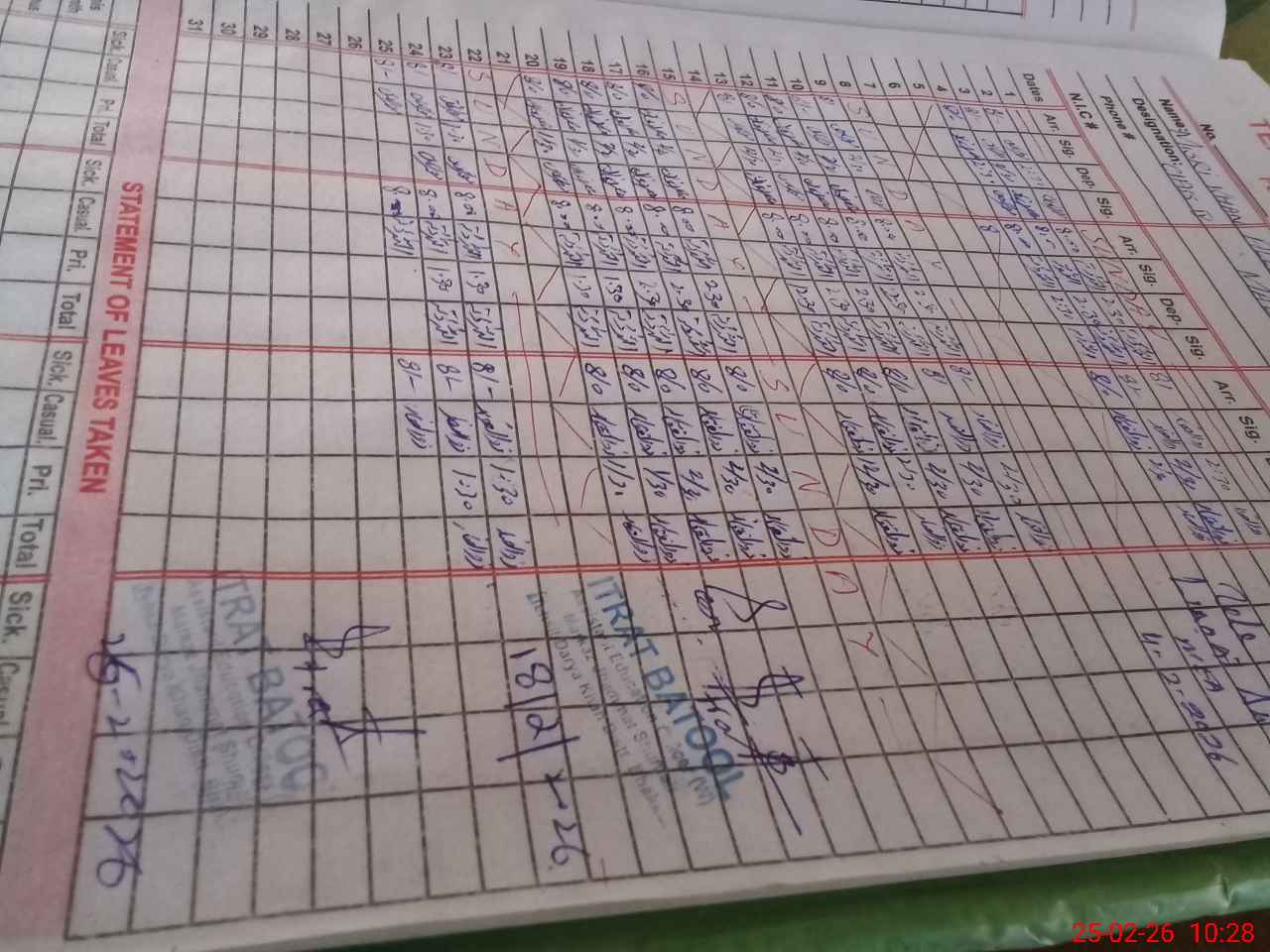 | CNIC | Full Name | Designation | R/C | Absence During Last Calender Month |