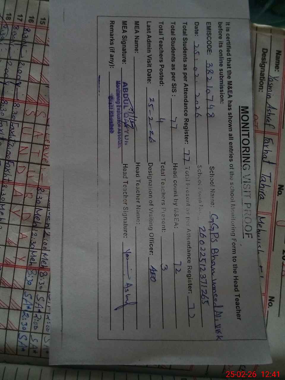 | EMIS Code: 38210748 | Name of School: GGPS BHAN UMEED ALI VIRK | |||