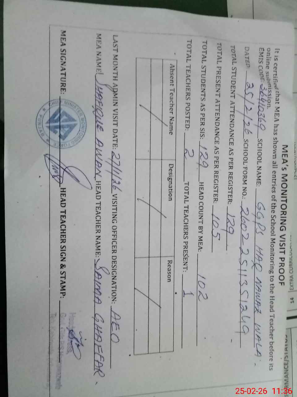 | EMIS Code: 36410369 | Name of School: GGPS HAQ NAWAZ WALA, KABIRWALA | |||