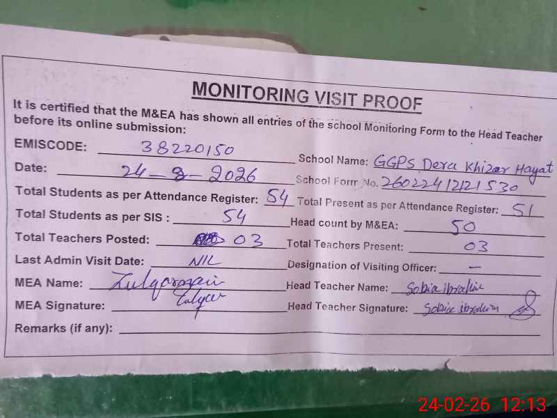| EMIS Code: 38220150 | Name of School: GGPS DERA KHIZAR HAYAT | |||