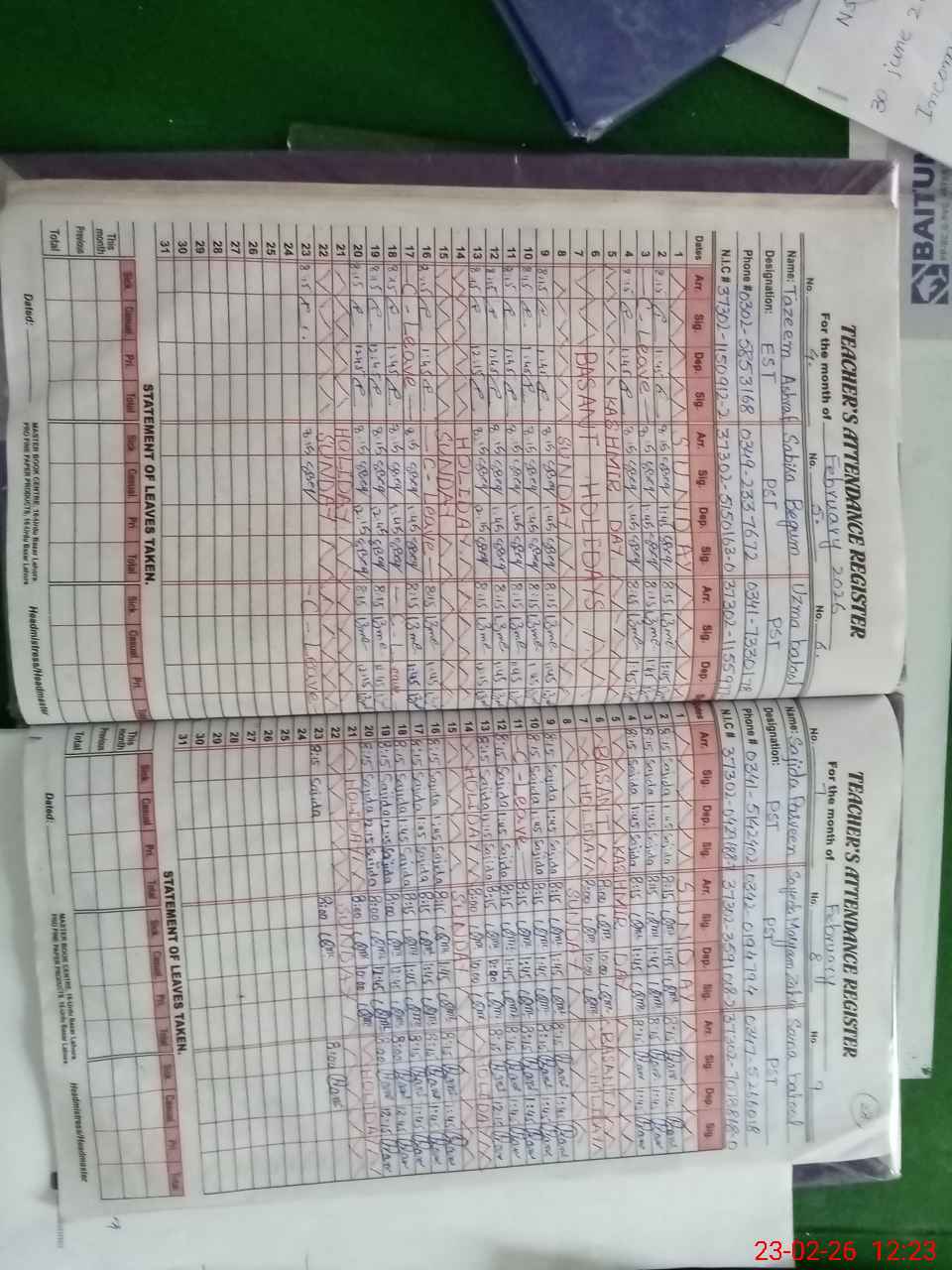 | CNIC | Full Name | Designation | R/C | Absence During Last Calender Month |