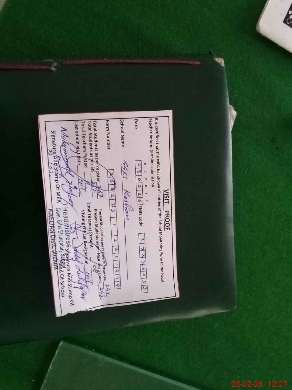 | Attendance Register | Head Teacher | MEA with School | Visit Proof |
