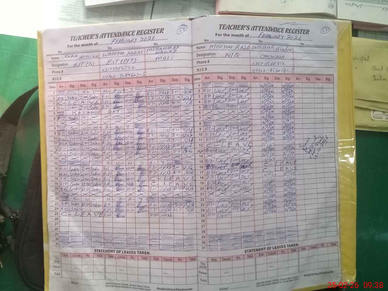 | Total no. of Classrooms: 10 No. of Classrooms Used for Teaching: 6 No. of Classrooms Storing Old Furniture, FTBs, etc: 0Comments if Any: Sir. Headmaster SST Shouket not complete monthly closed record of NSB during visit he complete the record but he no knowledge about the ADP funnd where Included it. Roznamacha of students attendance not complete. Teacher Sabir not present in school his |