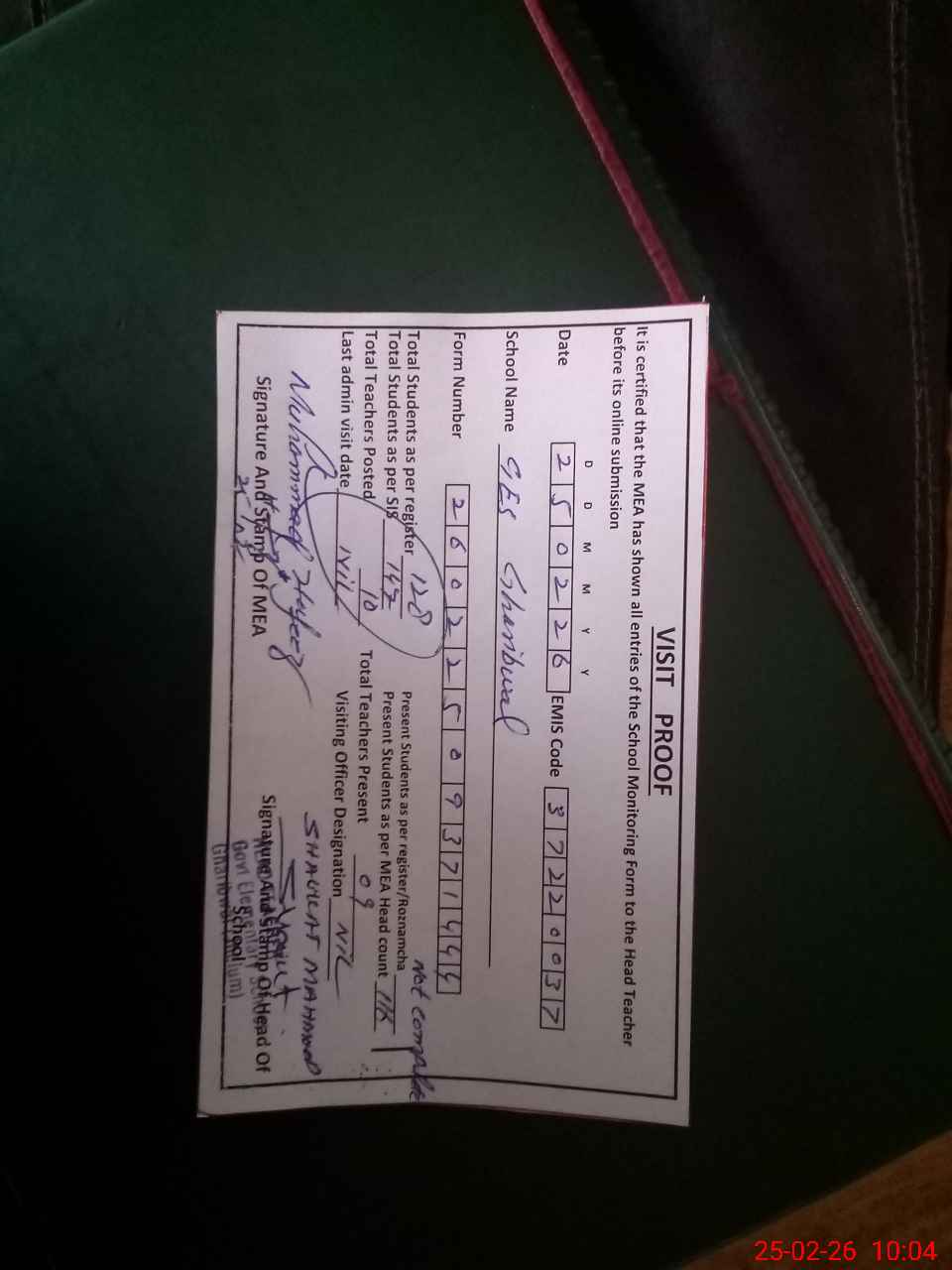 | Remarks (Use Separate Page if Required): Sir. Headmaster SST Shouket not complete monthly closed record of NSB during visit he complete the record but he no knowledge about the ADP funnd where Included it. Roznamacha of students attendance not complete. Teacher Sabir not present in school his leave written on teacher attendance register but not shown on SIS and HRMIS. I show him absent. Cleaning of class rooms very very poor dust on teacher table and bunches. | |||||