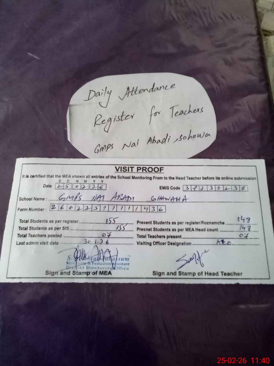 | Attendance Register | Head Teacher | MEA with School | Visit Proof |