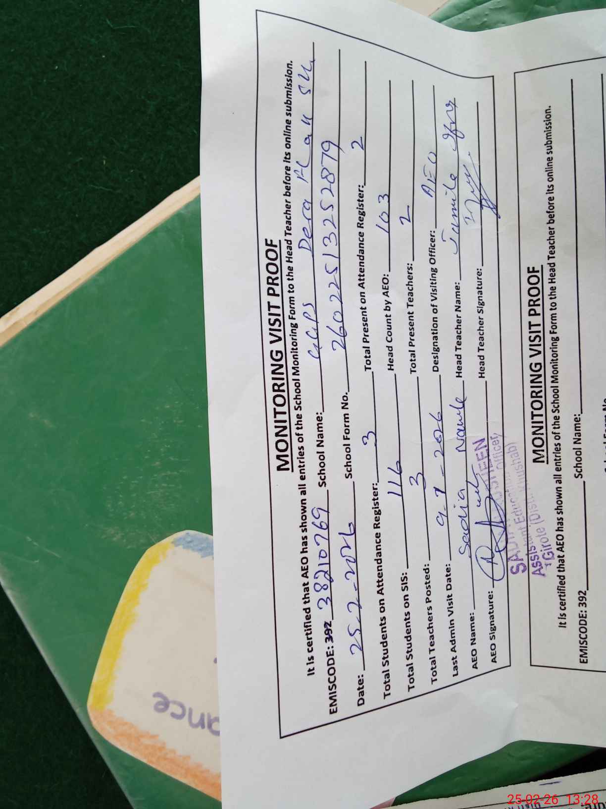 | Attendance Register | Head Teacher | MEA with School | Visit Proof |